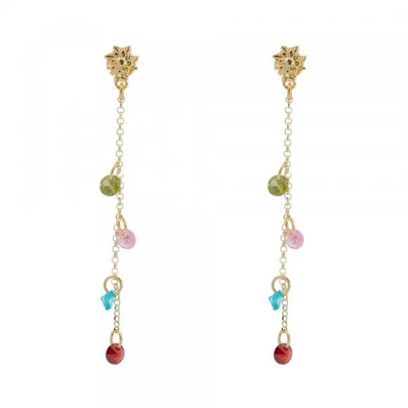 Pendientes largos Eguzkilore de Plata de 1ª Ley (925mm) bañados en oro 18kt. con motivo Eguzkilore en la parte superior y cadena y cristales multicolor colgando. Cierre de presión y cadena tipo rolo. Medida pendiente: alto 52mm. Diámetro Eguzkilore: 6mm. Diámetro cristales: 3mm.