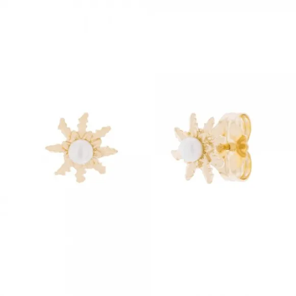 Pendientes de Plata de 1ª Ley (925mm) cubiertos por un baño de Oro Amarillo de 18kt. con motivo Eguzkilore una perla cultivada en la parte central de 3mm y cierre a presión. Diámetro de los pendientes: 11mm.