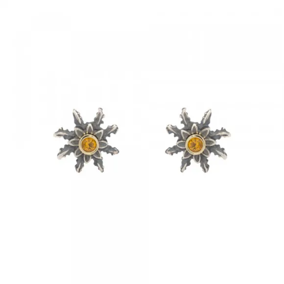 Pendientes de Plata de 1ª Ley (925mm) bañados en Oro 18kt. con motivo eguzkilore en plata envejecida y circonita color champagne en la parte central. Cierre presión. Diámetro del pendiente: 12mm. Diámetro de la circonita: 2mm.
