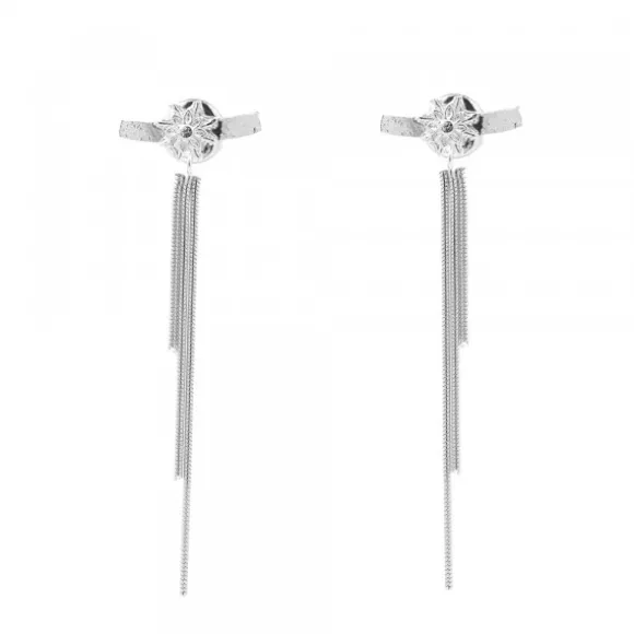 Pendientes Kea de Plata de 1ª Ley (925mm) con motivo Eguzkilore en el centro y cierre presión compuesto por cadena tipo cola de ratón colgando en diferentes larguras. Medida pieza central: alto 7mm y ancho 15mm. Diámetro Eguzkilore: 7mm. Larguras cadena topo: 20mm, 35mm y 50mm.