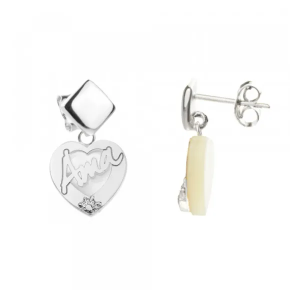*No se admiten cambios ni devoluciones en artículos de Outlet.Pendientes largos de Plata de 1ª Ley (925mm) y nácar en forma de corazón y grabación «Ama» alrededor del corazón. Cierre presión. Diámetro del Corazón: 12mm.