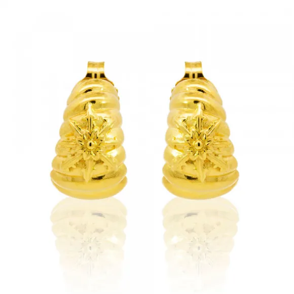 Pendientes medio aro de la colección Mask de Plata de 1ª Ley (925mm), bañados en oro 18kt., evocan la belleza del mar con su diseño inspirado en una concha marina. Medida pendientes: alto 20mm y ancho 17mm. Diámetro Eguzkilore: 11mm. Cierre presión.