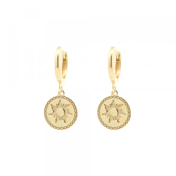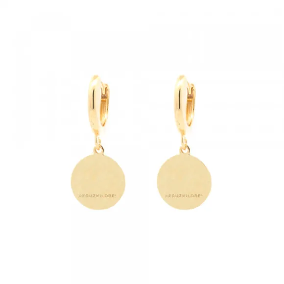 Pendientes largos con forma redondos de Plata de 1ª Ley (925mm) bañados en oro amarillo 18kt. con grafilado en el borde del pendiente y Eguzkilore grabado en el centro. Cierre de cripa. Medida pendiente: alto 23mm y ancho 8mm.