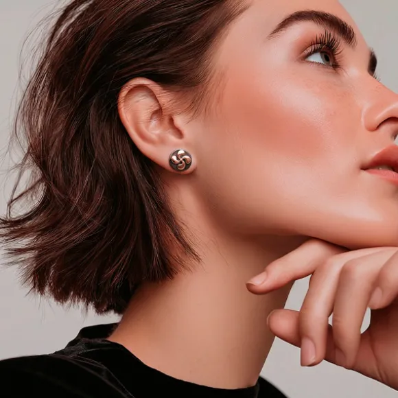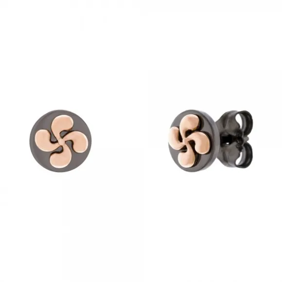 *No se admiten cambios ni devoluciones en artículos de Outlet.Pendientes de Plata de 1ª Ley (925mm) bañados en Rutenio con forma circular y motivo Lauburu cubierta por un baño de Oro Rosa de 18kt. en la parte central. Cierre presión. Diámetro: 9mm. Diámetro del Lauburu: 7mm.