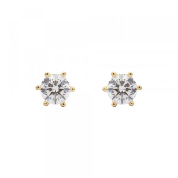 Pendientes de Plata de 1ª Ley (925mm) bañados en Oro 18kt. Contiene una circonita blanca en la parte central engarzada con 6 patas de plata dorada. Cierre presión. Diámetro del pendiente: 11mm. Diámetro de la circonita: 10mm. Grosor de la pata: 1mm.
