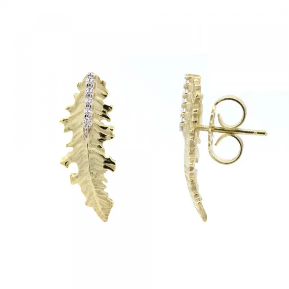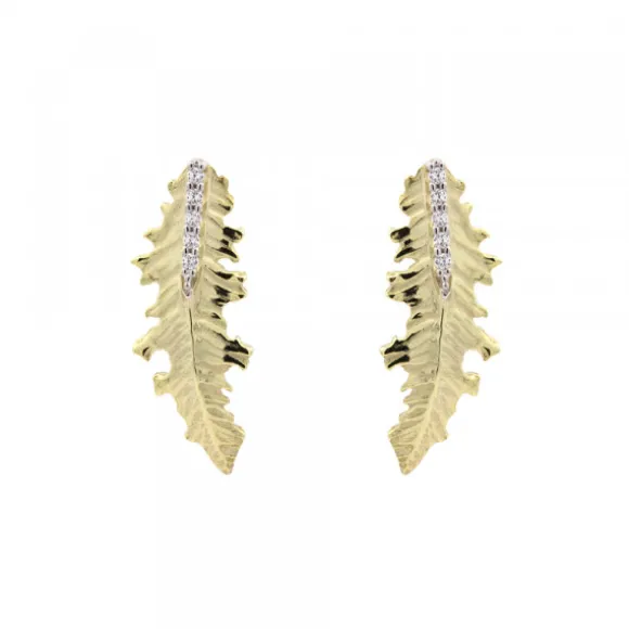 Pendientes trepador de Plata de 1ª Ley (925mm) bicolor con baño de Oro 18kt. (750mm) reciclado de la colección Mari. La pieza tiene forma de hoja del Eguzkilore adornada con circonitas blancas en carril. Cierre presión. Medida pendiente: alto 25mm y ancho 9mm.