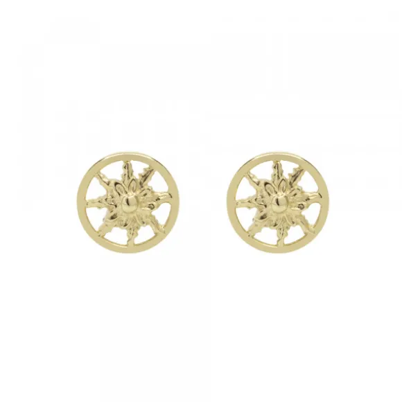 Pendientes de la colección Zero de oro reciclado (750mm – 18kt.) con forma de circunferencia calada y motivo Eguzkilore en el centro. Cierre de presión. Diámetro pendientes: 8mm. Diámetro Eguzkilore: 6mm