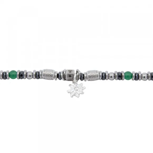 Pulsera de Acero con cuentas de jade verde, hematites y acero. Contiene motivo Eguzkilore de Plata de 1ª Ley (925mm). Largura pulsera: 19cm + 3cm de alargador para ajustarlo a diferentes medidas. Diámetro Eguzkilore: 10mm. Diámetro jade verde: 4mm. Pieza rectangular: largo 6mm y ancho 5mm. Pieza acero: alto 4mm y ancho 1mm.