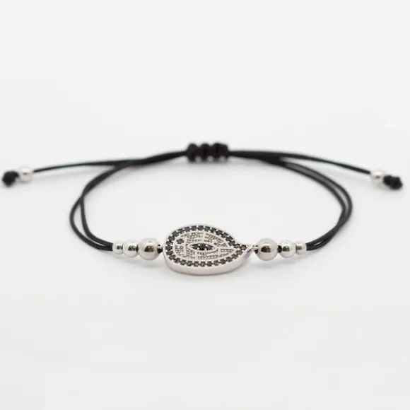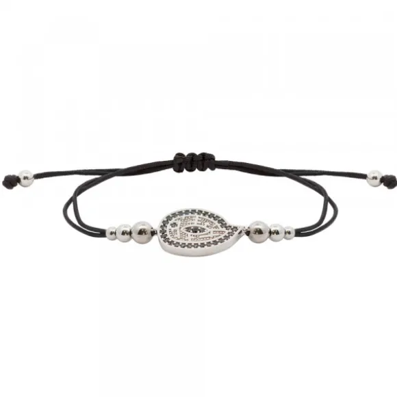 Pulsera de hilo negro ajustable con motivo en forma de la almendra de Vitoria-Gasteiz en Plata de 1ª Ley (925mm) cubierto por circonitas negras. Contiene bolitas de plata decorativas en los terminales de la pulsera y a los laterales del motivo. Medidas de la almendra: 20mm de alto y 13mm de ancho. Diámetro de las bolitas: 4mm. Diámetro de las circonitas: 1mm. Medida pulsera abierta: 29cm.