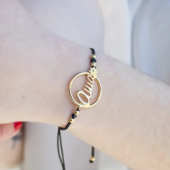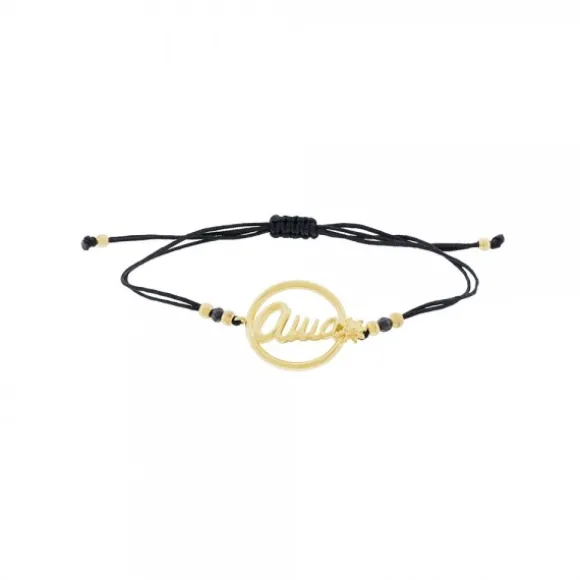 *No se admiten cambios ni devoluciones en artículos de Outlet.Pulsera ajustable de Plata de 1ª Ley (925mm) cubierta por un baño de Oro Amarillo de 18kt con macramé negro. Como motivo contiene una pieza de plata dorada con forma circular con la palabra «ama» en la parte central junto motivo Eguzkilore de plata dorada. Compuesta por 4 bolas circulares de plata dorada y 2 ónixs negros intercalados entre sí. En los dos extremos del macramé contiene 2 bolas. Medida de la pulsera: Largura máxima: 28cm. Diámetro del motivo: 20mm. Medidas ama: alto 8mm y ancho 17mm. Diámetro del Eguzkilore: 6mm. Diámetro de cada bola plata: 2mm. Diámetro de cada ónix facetado negro: 2mm. Grosor del cerco: 1mm.