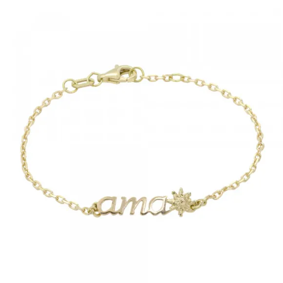 Pulsera de Oro de 1ª Ley (750mm-18kt.) Contiene la palabra «Ama» junto a motivo Eguzkilore. La cadena es una forza de hilo de 0,50. Tu mejor opción para el Dia de la Madre o cualquier otro día para demostrarle lo mucho que la quieres. Medida de la pulsera: 17cm, tiene dos posiciones: a 16cm y 17cm. Medidas ama: Alto: 4mm. Ancho: 17mm. Diámetro del Eguzkilore: 6mm.