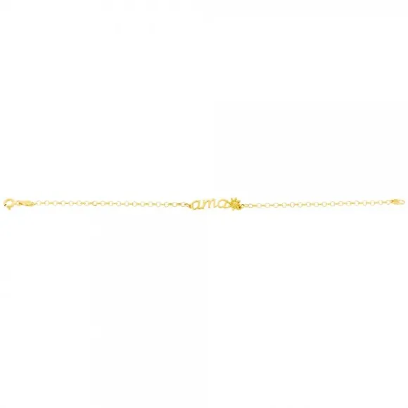 Pulsera de Oro Amarillo reciclado (750mm – 18kt.). Contiene la palabra «ama» junto a motivo Eguzkilore. La cadena es de tipo Rolo. Medida de la pulsera: 17,5cm. Medidas del motivo: Alto 6mm y ancho de 22mm.