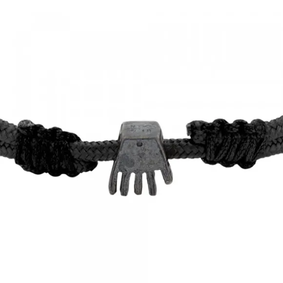 Pulsera de nylon negra con cuerdas corredizas negras y cierre macramé con charm de la mano de Irulegi de Plata de 1ª Ley (925mm) bañada en rutenio. Diámetro Charm: 10mm. Grosor de la pulsera: 2mm.