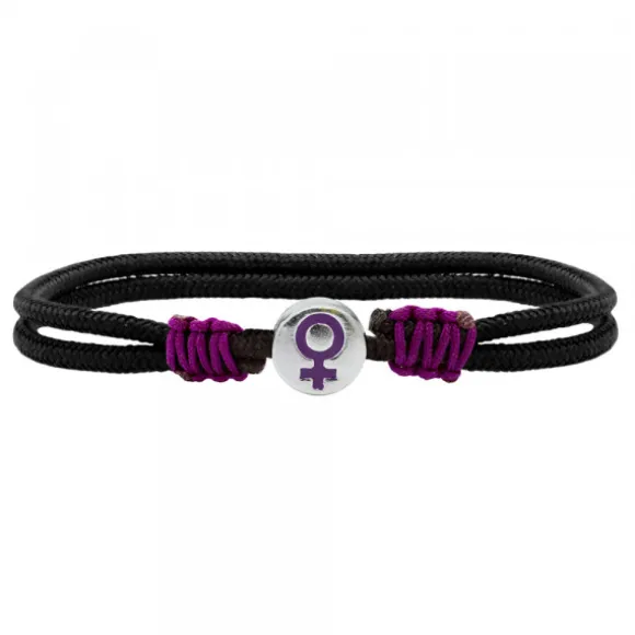 Pulsera de macramé negro con charm de Plata de 1ª Ley (925mm) con el Símbolo de La Mujer en surco con esmalte morado. Cierre ajustable. Pieza de la colección Morea, en favor de la Igualdad y del Empoderamiento de la Mujer. Medidas Charm: 13mm alto y 8mm ancho. Medida de la pulsera cerrada: 6cm de diámetro.