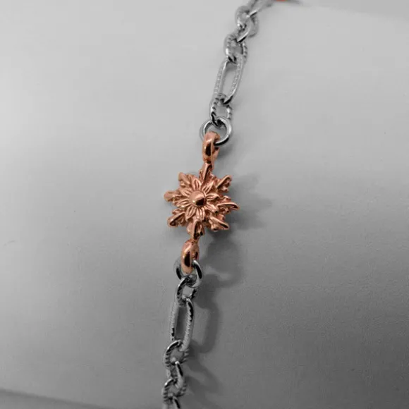 Pulsera de Plata de 1ª Ley (925mm) con 3 motivos Eguzkilore de plata bañados en oro rosa 18kt. compuesta por cadena de eslabones alargados grafilados de diferentes medidas. Cierre langosta. Largura pulsera: 17,5cm + 3cm de alargador para ajustarlo a diferentes medidas. Diámetro Eguzkilore: 8mm.
