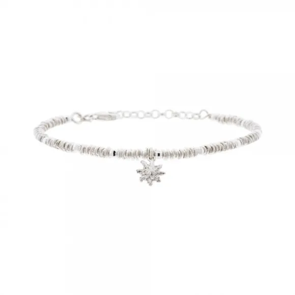 Pulsera de Plata de 1ª Ley (925 mm) compuesta por piezas de mallina de plata y piezas circulares facetadas de plata intercaladas entre sí. Como motivo principal contiene Eguzkilore de plata. Medida de la pulsera: 16cm + 3cm de alargador. Diámetro del Eguzkilore: 9mm. Medidas de cada pieza mallina: Alto 3mm y ancho 0,5mm. Diámetro de cada pieza circular facetada: 2mm.