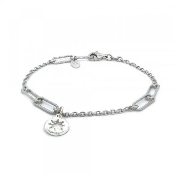 Pulsera de Plata de 1ª Ley (925mm) con cadena rolo y eslabones jaspeados. Contiene pieza de plata circular con forma Eguzkilore calado. Medida de la pulsera: 19cm con eslabones ajustables en 17 y 18cm. Medida de los eslabones: 11mm de largo y 5mm de ancho. Diámetro del motivo Eguzkilore: 9mm.