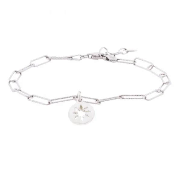 Pulsera de Plata de 1ª Ley (925mm) con cadena de eslabones recta alargada de acabado martelé con pieza de plata circular con forma Eguzkilore calado. Medida de la pulsera: 17,5cm + 2cm de alargador.