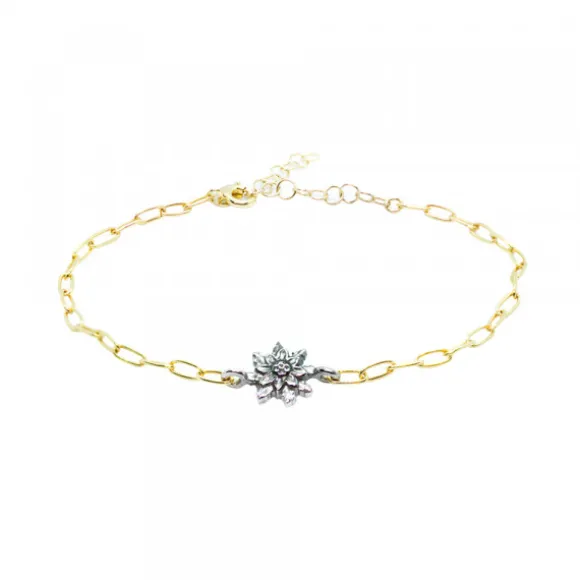 Pulsera de Plata de 1ª Ley (925mm) bañada en oro amarillo de 18kt. con cadena de eslabones y motivo Eguzkilore de plata dorada. Medida de la pulsera: 16cm + 4cm de alargador.