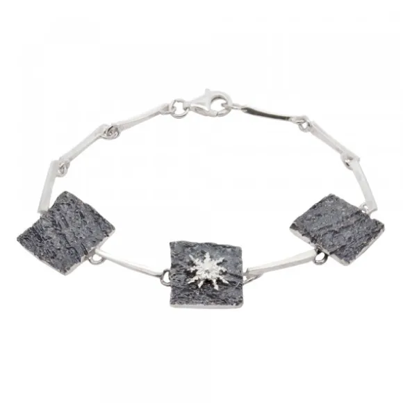 Pulsera de Plata de 1ª Ley (925mm) con barras de 14mm unidas, tres piezas centrales cuadradas simulando el Flysch y en la pieza central un Eguzkilore de plata. Medidas de las piezas cuadradas: 14mm de ancho y 14mm de alto. Medida de la pulsera: 18,5cm. Cierre mosquetón.