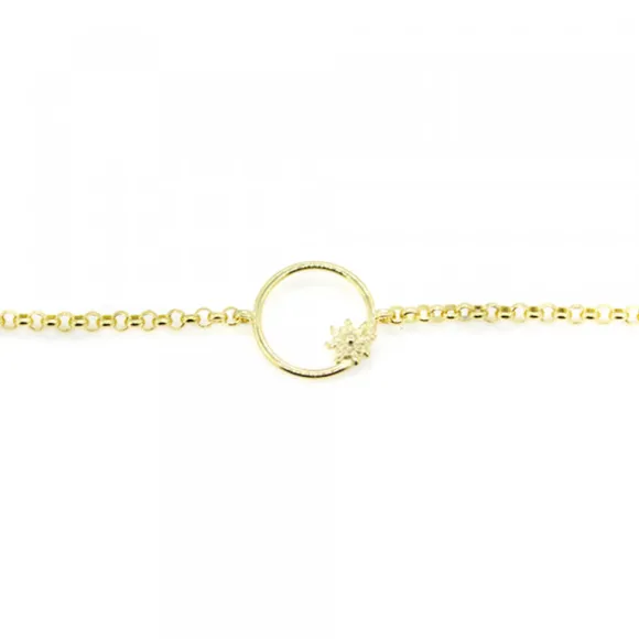 Pulsera Luna Llena de Plata de 1ª Ley (925mm) bañada en Oro Amarillo de 18kt. con pieza de plata redonda simbolizando la «Luna Llena« con motivo Eguzkilore en un lateral. Medida de la pulsera: 16cm con alargador. Posiciones en cierre de 16, 17 y 18cm.