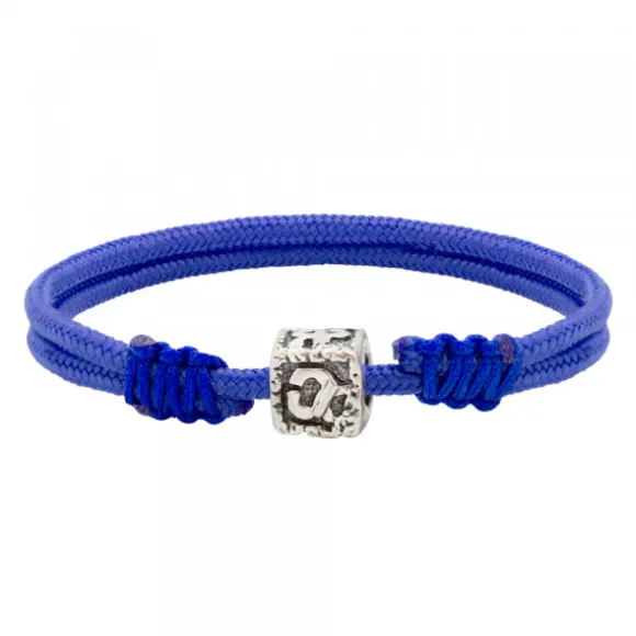 Pulsera de nylon azul con cuerdas corredizas y cierre macramé con charm con forma El Peine de los Vientos del escultor Chillida de la ciudad de Donostia- San Sebastian de Plata de 1ª Ley (925mm). Diámetro Charm: 8mm.