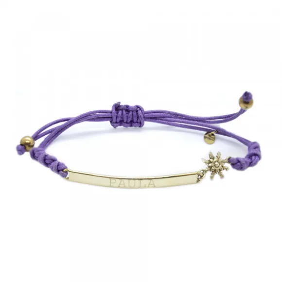 *No se admiten cambios ni devoluciones en artículos de Outlet.Pulsera morada Zubi con cuerdas corredizas y barra de Plata de 1ª Ley (925mm) con baño de oro personalizada con el nombre «Paula». Opción no personalizable con otro nombre.