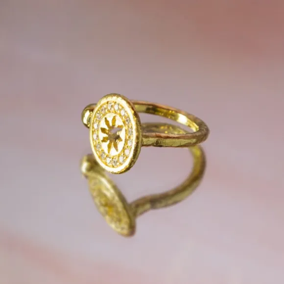 *No se admiten cambios ni devoluciones en artículos de Outlet.Anillo B1 de Plata de 1ª Ley (925mm) cubierta por baño de oro amarillo de 18kt. con pieza de plata dorada circular con forma Eguzkilore calado, rodeado de 16 circonitas blancas y terminal circular. Grosor del brazo: 2mm. Diámetro de cada circonita de la pieza circular: 1mm.