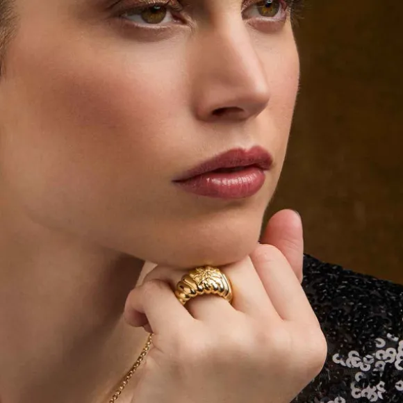 Anillo grande de la colección Mask de Plata de 1ª Ley (925mm) bañado en oro 18kt. que evoca la belleza del mar con su diseño inspirado en una concha marina. Contiene fleje interior para poder achicar hasta 2 tallas. Anchura: 13mm. Grosor: 3mm. Diámetro Eguzkilore: 12mm. Indicar la medida deseada en el desplegable.