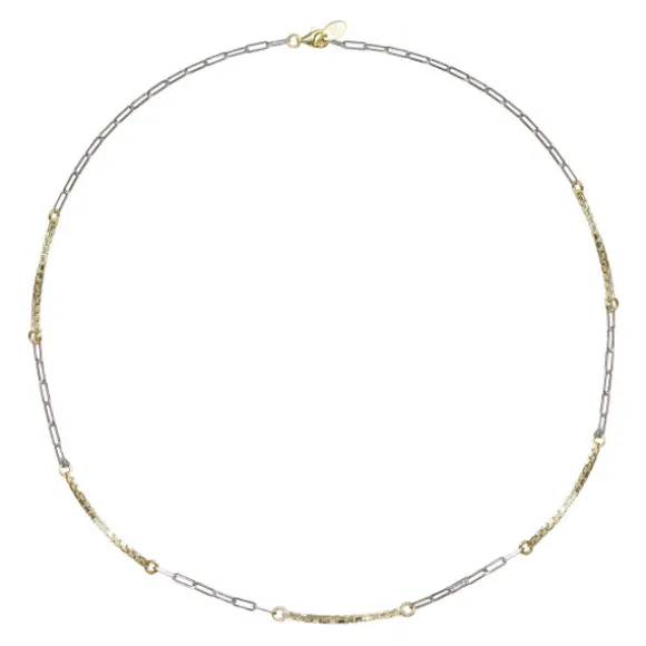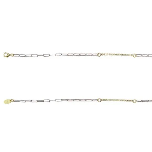 Cadena de Plata de 1ª Ley (925mm) bicolor alternada con eslabones alargados plata y grecas de plata bañada en oro 18kt.. Medidas disponibles: 40cm, 45cm y 50cm. Seleccionar medida en el desplegable.