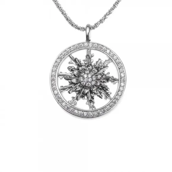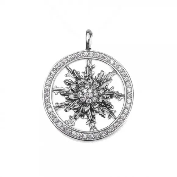 Colgante personalizable de Plata de 1ª Ley (925mm) con cerco y forma Eguzkilore de plata negra, ambas cubiertas por circonitas blancas. Incluye la grabación de un nombre o fecha en la parte trasera. Segunda grabación no incluida. Diámetro del colgante: 26mm. Medidas de la reasa: Alto 2mm y ancho 6mm. Diámetro del Eguzkilore: 21mm. Grosor del cerco: 2mm. Diámetro de cada circonita: 1mm. Cadena no incluida.*Una vez realizada la grabación, no se admite devolución.
