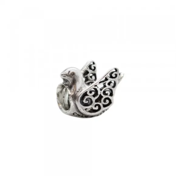 Charm de Plata de 1ª Ley (925mm) con forma de paloma de la paz. En la parte inferior de la pieza lleva escrita la palabra «peace». Compatible con pulseras y collares de Eguzkicharm y otras marcas. Diámetro del charm: 11mm de alto y 13mm de ancho.