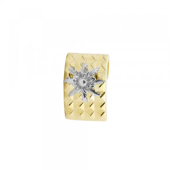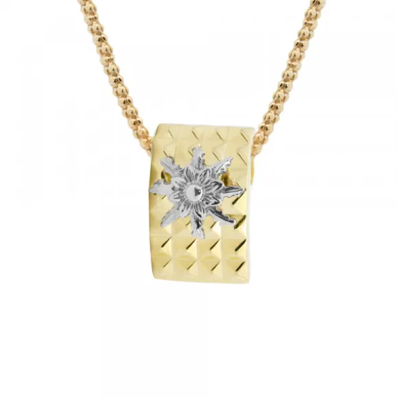 Colgante Aiora de Plata de 1ª Ley (925mm) bañado en Oro 18kt. (750mm) reciclado, con forma rectangular cóncava simulando tachuelas piramidales cuadradas. En la parte central contiene un Eguzkilore de plata y en la parte trasera se encuentra oculta una reasa doble. Medida colgante: alto 18mm y ancho 12mm. Diámetro Eguzkilore: 11mm. Medida reasa: alto 5mm y ancho 3mm. Cadena no incluida.