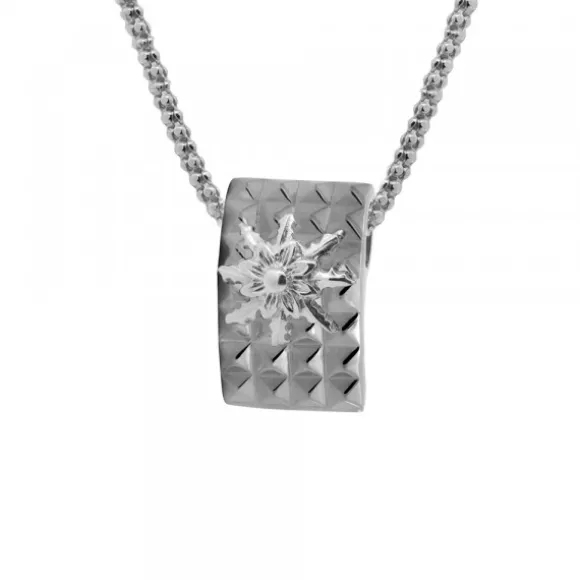 Colgante Aiora de Plata de 1ª Ley (925mm) bañado en Rutenio con forma rectangular cóncava simulando tachuelas piramidales cuadradas. En la parte central contiene un Eguzkilore de plata y en la parte trasera se encuentra oculta una reasa doble. Medida colgante: alto 18mm y ancho 12mm. Diámetro Eguzkilore: 11mm. Medida reasa: alto 5mm y ancho 3mm. Cadena no incluida.
