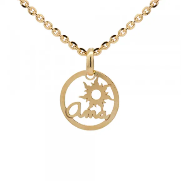 Colgante calado de Plata de 1ª Ley (925mm) bañado en oro 18kt. con letras Ama en el centro y motivo Eguzkilore en la parte superior de la pieza. Diámetro colgante: 15mm. Medida reasa: alto 7mm y ancho 5mm. Cadena no incluida.