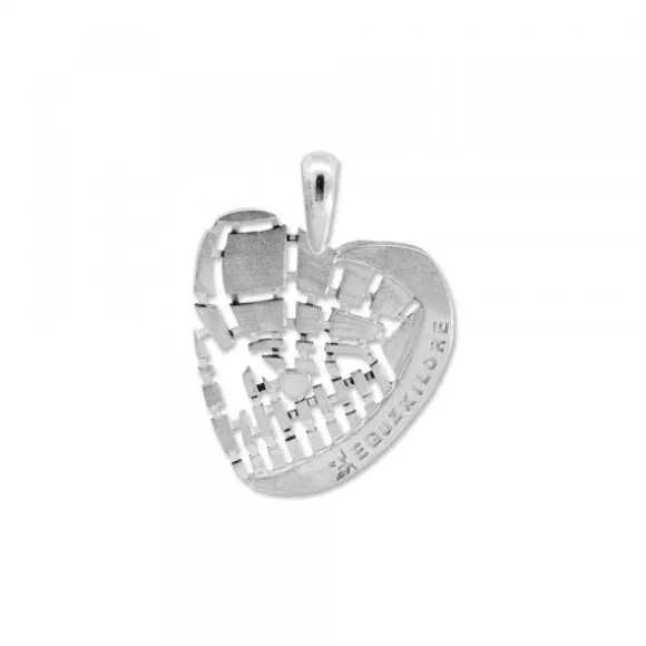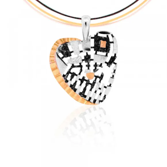 Este colgante reinterpreta el emblemático Casco Viejo de Bilbao y sus 7 calles con un diseño moderno y lleno de carácter. Elaborado artesanalmente en Plata de 1ª Ley (925mm), muestra el entramado urbano de las Siete Calles mediante formas geométricas caladas y contrastes de textura en plata y rutenio. La ría que bordea el corazón se presenta en una fina lámina de oro 18kt., aportando un brillo cálido y elegante que realza la pieza. En el interior, se incorporan también dos detalles en oro, que simbolizan la Catedral de Santiago y la Plaza Nueva, dos enclaves característicos del corazón de Bilbao. Una joya con significado, que fusiona tradición y diseño contemporáneo, perfecta para quienes desean llevar un pedacito de Bilbao. Medida colgante: alto 25mm y ancho 24mm. Reasa: alto 6mm y ancho 4mm. Cordón no incluido.