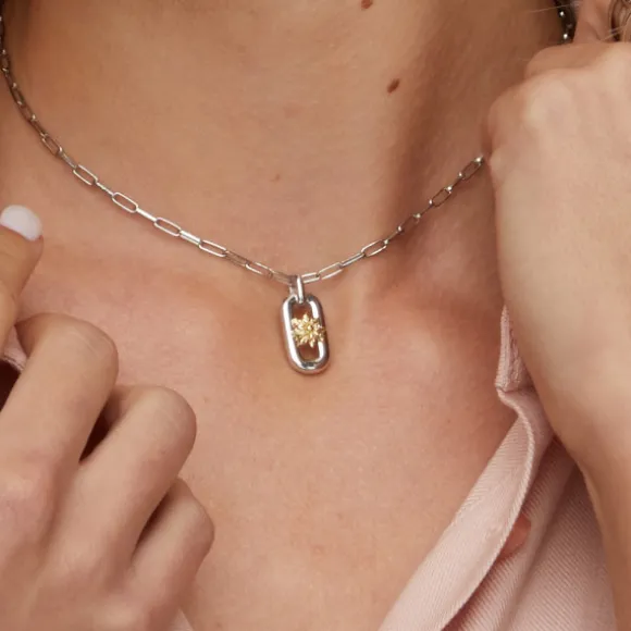 Colgante Bayona de eslabón de Plata de 1ª Ley (925mm) con Eguzkilore integrado en la parte central bañado en oro amarillo (750mm – 18kt.). Altura del colgante: 22mm. Anchura del colgante: 9mm. Medida del Eguzkilore: 7mm. Cadena no incluida.