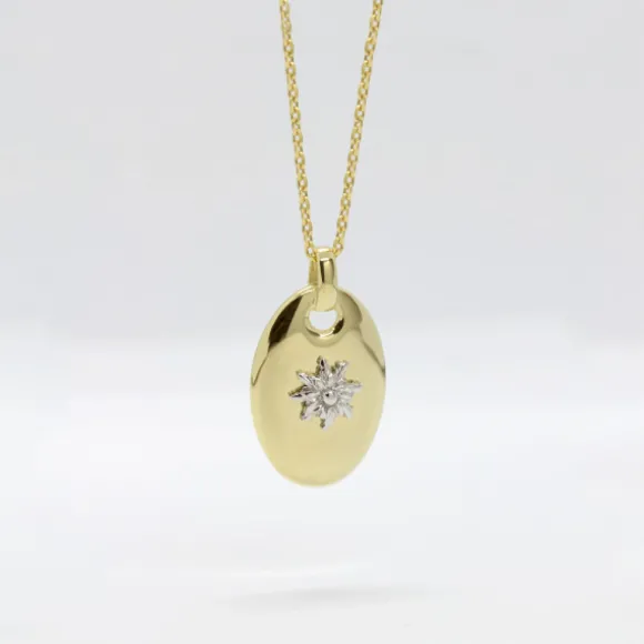 Colgante de la colección Donna de plata de 1ª Ley (925mm) bañado en oro de 18kt. con forma de calabrote y motivo Eguzkilore en el centro en plata. La reasa del colgante es rígida. Medidas colgante: alto 25mm y ancho 19mm. Medidas reasa: alto 6mm y ancho 4mm. Diámetro Eguzkilore: 7mm. Cadena no incluida.