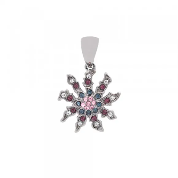 Colgante de Plata de 1ª Ley (925mm) con baño de rutenio con circonitas en tonalidades rosas, azules y blancas. Medidas colgante: alto 26mm y ancho 18mm. Diámetro Eguzkilore: 18mm. Medidas reasa: alto 9mm y ancho 7mm. Cadena no incluida.