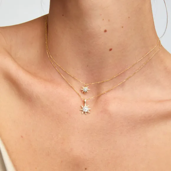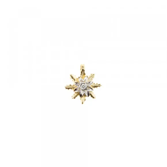 Colgante mini de Oro reciclado (750mm – 18kt.) con la parte central en Oro Blanco de 1ª Ley en forma de Eguzkilore con diamante talla brillante en la parte central. Diámetro del Eguzkilore: 9,5mm. Medidas de la reasa: Alto 4mm y Ancho 3mm. Cadena no incluida.