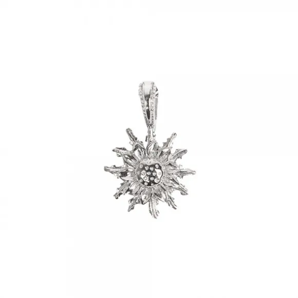 Colgante pequeño de Plata de 1ª Ley (925mm) con forma de Eguzkilore. Diámetro del colgante: 14mm. Medidas de la reasa: Alto 6mm y Ancho 2mm. Cadena no incluida.