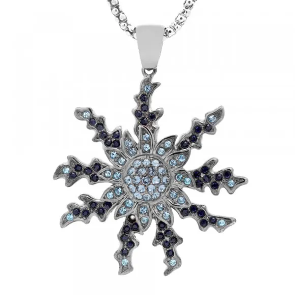 Colgante Eguzkilore de plata de 1ª Ley (925mm) bañado en Rutenio con circonitas en tonalidades azules. Diámetro del Eguzkilore: 45mm. Medidas de la reasa: alto 10mm y ancho 6mm. Cadena no incluida.