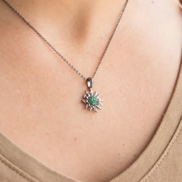 Colgante Eguzkilore de Plata de 1ª Ley (925mm) bañado en rutenio cubierto por 12 circonitas verdes en la parte central. Diámetro del Eguzkilore: 14mm. Medidas de las reasa: Alto 6mm y Ancho 2mm. Diámetro central de circonitas: 5mm. Diámetro de cada circonita: 1mm. Cadena no incluida.