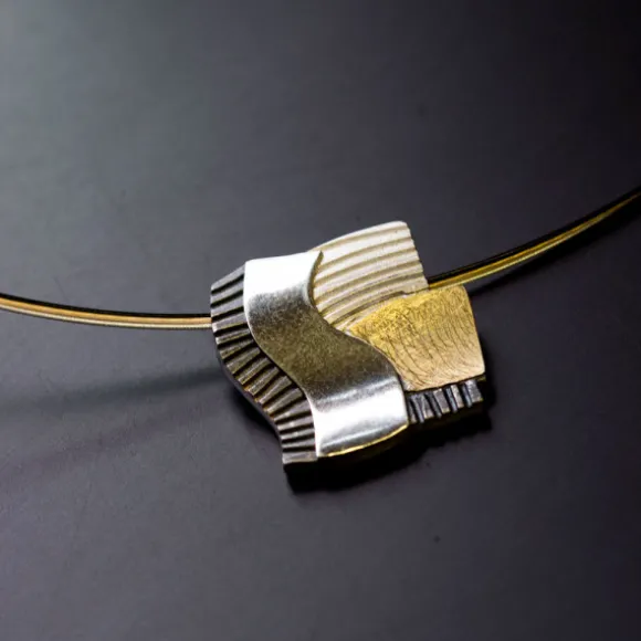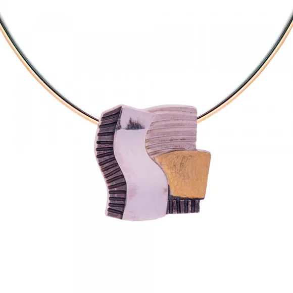 Colgante de Plata de 1ª Ley (925mm) con diferentes acabados y texturas y lámina de oro de 18kt (750mm) elaborado artesanalmente. Interpretación del icónico Museo Guggenheim de Bilbao, hecha por Joyería Eguzkilore. El colgante está compuesto por dos reasas ocultas en la parte trasera de la pieza. Diámetro colgante: 22mm. Medida reasa: 3mm. Cable no incluido.