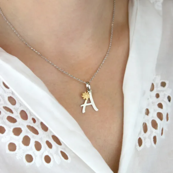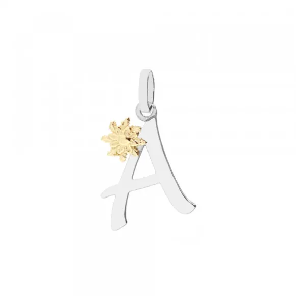 Colgante Inicial personalizable de Plata de 1ª Ley (925mm) y forma Eguzkilore en el lateral izquierdo bañado en Oro Amarillo de 18kt. Medidas de la inicial: Alto 18mm y Ancho 14mm. Medidas de la reasa: 7mm alto y 5mm ancho. Diámetro del Eguzkilore: 6mm.* Cadena no incluida.