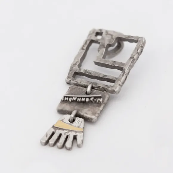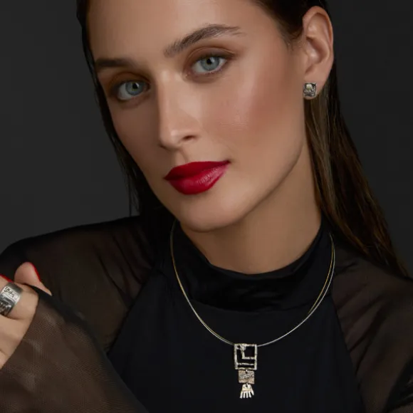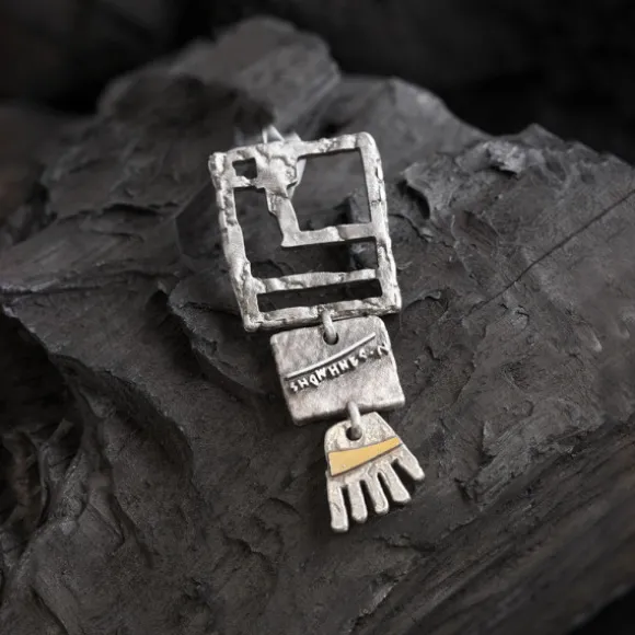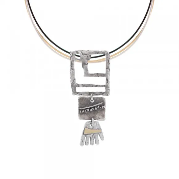 Colgante Irulegi de Plata de 1ª Ley (925mm) con forma rectangular en acabado mate compuesto por tres piezas. La pieza superior tiene la forma del castillo en relieve y el lugar donde se encontró la mano de Irulegi. En la del centro se puede apreciar una inscripción hallada de la época y la tercera pieza tiene forma de la mano de Irulegi con lámina de Oro 18kt. (750mm) atravesando la misma. La reasa se encuentra oculta en la parte trasera de la pieza superior. Cadena no incluida.
