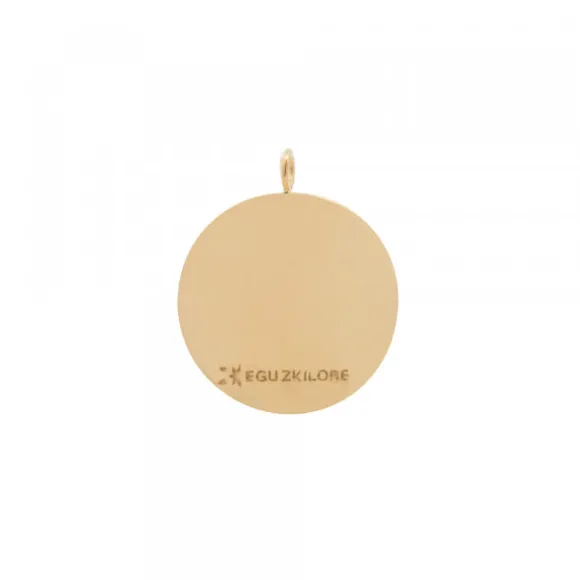 Colgante de Plata de 1ª Ley (925mm) bañado en oro amarillo de 18kt.. Contiene una pieza de plata con forma circular con la frase «Maite Zaitut Ama» en relieve con motivo Eguzkilore, corazón, estrella y luna en el interior del colgante. Ideal para el Día de la Madre. Diámetro del colgante: 25mm. Diámetro del Eguzkilore: 5mm. Se puede personalizar por la parte trasera con un nombre corto o fecha. Cadena no incluida.*Una vez realizada la grabación, no se admite devolución.