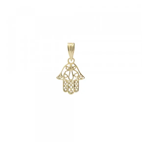 Colgante con forma de mano de Fátima en lámina de Oro reciclado (750mm – 18kt.). Este colgante simboliza la buena suerte y el amor. Medida colgante: alto 20mm y ancho 10mm. Medida de la mano: alto 14mm y ancho 10mm . Medida reasa: alto 7mm y ancho 4mm. Cadena no incluida.