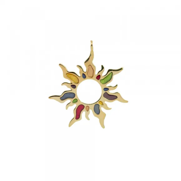 Colgante Mountain de Plata de 1ª Ley (925mm) bañado en oro 18kt. con forma Eguzkilore y compuesto por gotas con esmalte multicolor. Diámetro colgante: 39mm. Diámetro reasa: 5mm. Cadena no incluida.