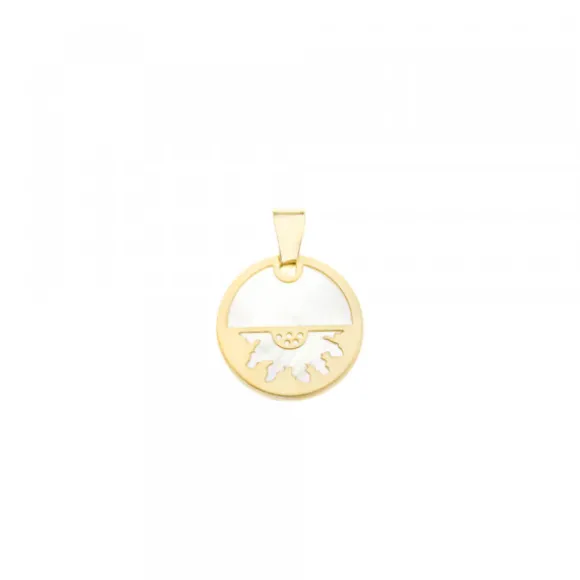 *No se admiten cambios ni devoluciones en artículos de Outlet.Colgante de Plata de 1ª Ley (925mm) bañado en Oro amarillo de 18kt. y nácar en forma redonda con motivo Eguzkilore. Medida:15mm de diámetro.